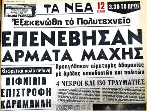 ![]() The front page of Ta Nea the morning after the killings. The surtitle reads "The Polytechnic evacuated" and the banner headline "Tanks intervened". The subtitles read "Street battles with groups of students and civilians came first" and "4 dead and 130 wounded". The casualty list would climb, but a definitive tally has never been made  |