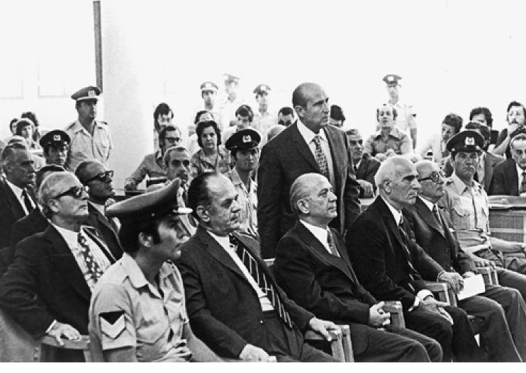 ![]() The dictators on trial in 1975 (front row L-R): George Papadopoulos, Nikolaos Makarezos, Stylianos Pattakos. Standing behind them is Nikos Ioannidis, who unseated them in an internal coup after the Polytechnic killings, for which, as chief of the military police, he was largely responsible. The three instigators of dictatorship were given death sentences, commuted to life in prison, largely because of their handling of the student uprising. Ioannidis was handed a sevenfold life sentence  |