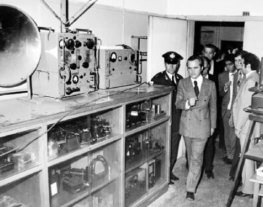 ![]() Deputy Press Minister Spyros Zournadzis escorts a press corps around the Polytechnic campus after the suppression of the uprising. Here, he is demonstrating the radio station students had put together from laboratory equipment  |