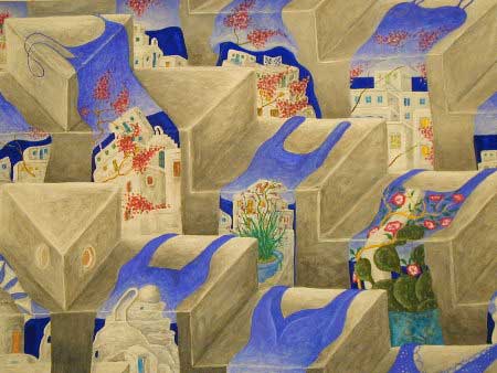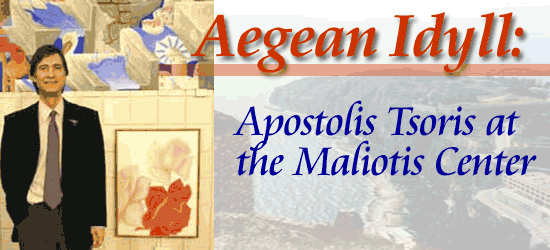 | The art of Apostolos Tsoris conveys the feeling of an idyll among the Aegean islands. The world he depicts in his vibrant, colorful paintings is one of blue church domes, sailboats, roosters, bouzoukis, wooden chairs, and wine. | ![]()  |