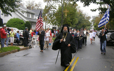On Saturday morning, September 23rd, a religious service was performed in the Greek Orthodox Church by His Grace, Bishop Vikentios and Bishop Damaskinos of Daflias from Greece with local Greek Orthodox clergy. A 9/11 Service was performed to remember those who perished at the World Trade Center. The religious procession commenced from the church to the docks in front of Claudio's Restaurant. Seeing the American and Greek flags waving in the drizzling rain made one proud. At the harbor pier, the Christian clergy with politicians memorialized and prayed for our fallen American heroes.  |
