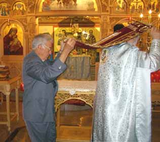 On August 15th, at the Transfiguration Church in Mattituck, N.Y., a donation of an epitafio (holy tapestry representing the tomb of the Virgin Mary) was presented and blessed in a unique ceremony. George and Irene Moustakos of Astoria and Mattituck, New York donated the epitafio. The blessing of the Virgin Mary's tomb was witnessed by over three hundred persons.  |