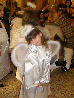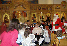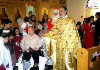 "We have a future and not a past," said Rev. Alexander Karloutsos, protopresbyter of the Kimisis Tis Theotokou Church. "It is not us that are going to build a parish, but the Lord." Children, who performed in the Christmas Pageant, surrounded Ms. Johnides when she said, "I remember the early years. It gives me warmth and comfort to be here. These children are beautiful. We must never forget our Greek heritage. Our church is a house of love and happiness. We must proceed ahead." (Photo at right: Rev. Alexander Karloutsos describing Ms. Coula Johnides unique gift to the Kimisis Tis Theotokou church.)  |
