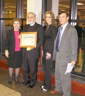 A graduate of Holy Cross School of Theology, Brookline, MA, he studied one year at the University of Athens School of Theology and received a Ph.D. in Ecumenics, Missions and World Religions at Boston University. Long active in interreligious outreach and dialogue, he has served as Ecumenical Officer of the Archdiocese, was the first Orthodox and youngest person ever elected recording secretary of the National Council of Churches. Author of Guidelines for Orthodox Christians in Ecumenical Relations, he is a Founding Member of Orthodox Dialogues with Catholics, Anglicans, Evangelicals and Jews. A frequent participant in international conferences, Father Robert was a member of the Church Leaders Peace Pilgrimage to the Middle East (December 1991); the 7th Assembly of the World Council of Church in Canberra, Australia (1991); and was a member of the National Council of Churches delegation to the USSR in 1974. (Photo at right: Rev. Dr. Robert Stephanopoulos presented with Award for Outstanding Teaching by Yvonne Cassimatis, 3rd from left to right, and Dr. John G. Siolas of the St. John's University Modern Greek Language and Literature Program, as Presvitera Nikki Stephanopoulos looks on at left).  |