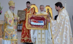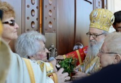 ![]() His Eminence gave the community the gift of an Epitafios of the Dormition of the Virgin Mary. Photo by Stavroula Raia.  |