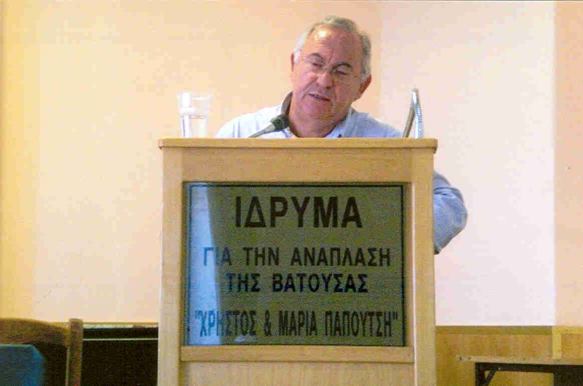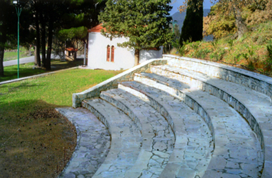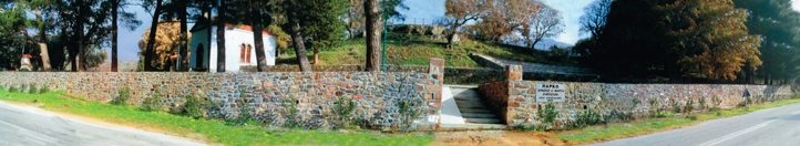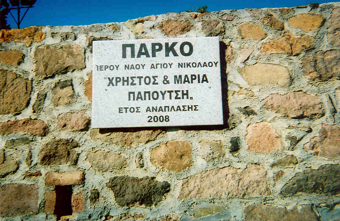 | Officers for the Christos and Mary Papoutsy Foundation for the Revitalization of Vatoussa held discussions during the design phase of the park with local and national church officials over the proposed development of park lands and renovation of its chapel. The park project received approval from and full support of the local Greek Orthodox hierarch, His Eminence Metropolitan Chrysostomos of Mithymna, and the Archdiocese of Greece headquartered at Athens. Construction of the project began in 2003 and proceeded in stages. Its cost has been about USD$500,000, with some monies contributed by Vatoussans and descendants abroad. Mr. Panagiotis Malamellis, a noted local painter, held an art exhibition in Boston (The Greek Institute, June 2001) in support of the park during its design-phase.  |