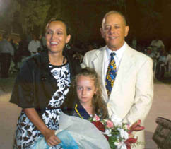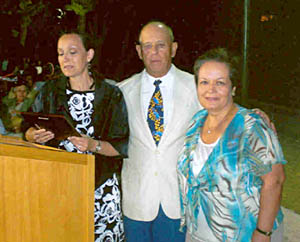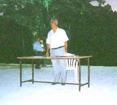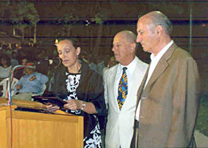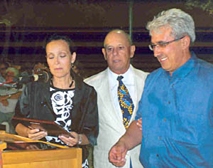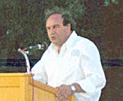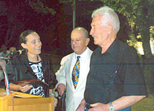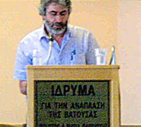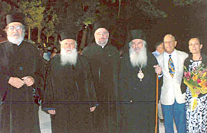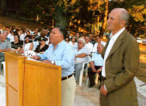 Following the ecclesiastical events, dignitaries formally welcomed the community to the park in the spectacular outdoor amphitheater. Capacity crowds listened attentively as a former provincial governor and minister congratulated the village. The municipal mayor, Mr. Sotiris Kardaras, added his welcoming and congratulatory remarks, as did the president of the sponsoring foundation, Mr. Christos Stavrakoglou, and the endowers of the park project. President Stavrakoglou spoke eloquently about the location of the park itself, the beauty, spirit and history of the locale. [Click here for English versions of his address.] Very Reverend Makarios Niakaros of Haverhill, Masachusetts, also addressed the crowd; a number of his American parishioners have ancestral roots on the island. Nationally renown publisher of (de)kata Literary Magazine and poet, Dino Siotis, likewise honored Vatoussans with his dramatic reading of a poem dedicated to the park's opening. He was a recipient last year of the prestigious Greek National Prize for Poetry and has helped to establish the International Athens Prize for Literature.  |