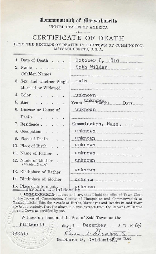 When requesting death certificates, you may be surprised by the “depth or dearth” of information recorded. Death certificates were not always required and were rare before the late 1800s. Early information is reconstructed from a variety of sources--manuscript books, civil registrations, cemetery records, parish records, etc. Town clerks or recorders issue certificates from available information, which often lacks genealogical details, such as a surviving spouse, parentage, cause of death, and burial location. This example from 1810 shows Seth Wilder, Jr.'s death in Cummington, Massachusetts, and little else. When ordered in 1965, a similar death certificate would typically include parental names, birth places, and occupation, which were all left blank on the 1913 form.