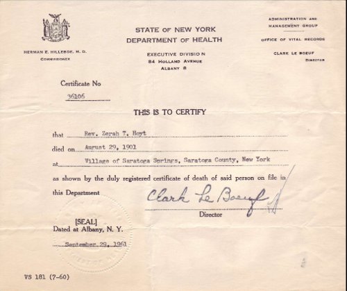 Until recently, each location, whether it be a country, state, county, or city, followed its own format. In 1961, the State of New York furnished this numbered certificate for Rev. Zerah T. Hoyt, certifying his death in Saratoga Springs on August 29, 1901.