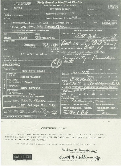 In 1917, Duval County, Florida required an address, age at death, informant, and place of burial or removal. In the case of John Thomas Wilder, who died on January 31, the informant was his second wife, Dora (Lee) Wilder, recorded only as Mrs. John T. Wilder. The document noted he was returned to Chattanooga, but did not specify the cemetery, which was Forest Hills.