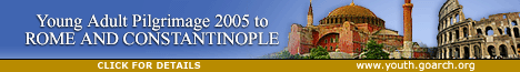 The registration and deposit deadline for the National Young Adult Pilgrimage has been extended until August 12, 2005. The additional $50 dollar late fee will also be waived if registration is postmarked by this extended date. Please keep in mind that this is the last chance to register at the reduced airfare rate. Registration after this date may include additional airline fees. Space is limited so make your reservation today for this amazing experience! All pertinent information can be found online at www.youth.goarch.org, including a Registration Packet available for download. If you have any questions about the pilgraimage, feel free to contact the Department of Youth and Young Adult Ministries [Atlanta Metropolis] at 646.519.6180 or youthoffice@goarch.org.  |