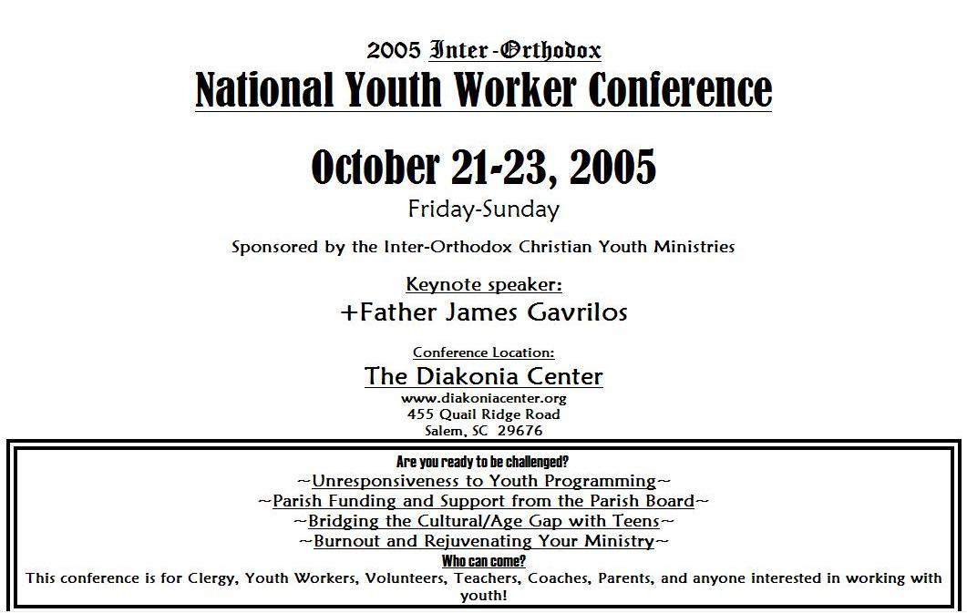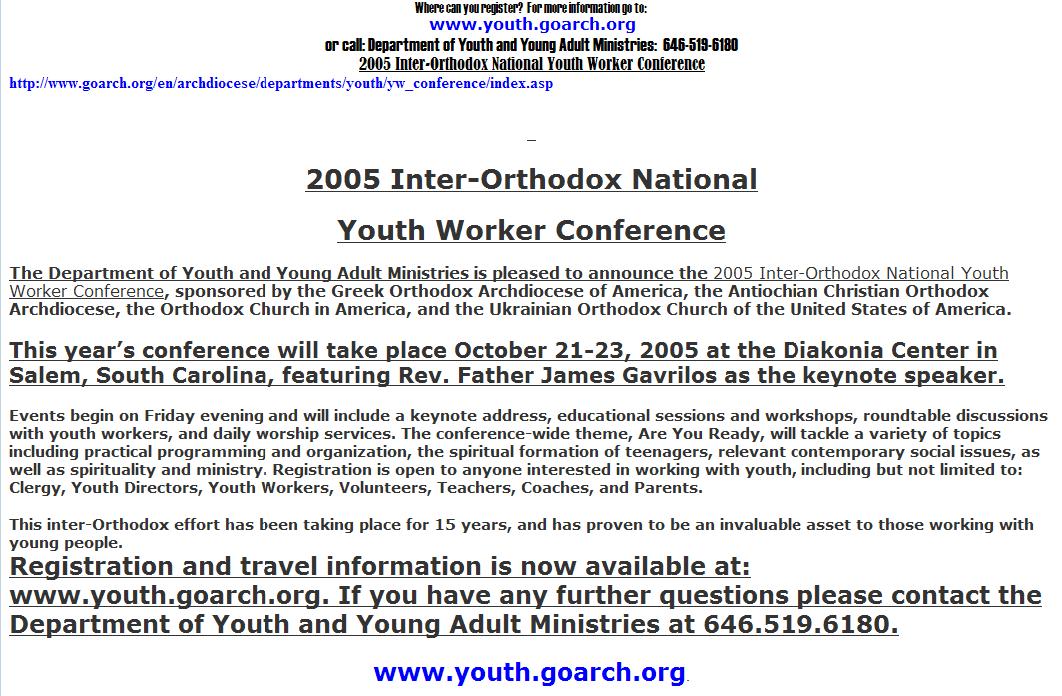 For more information about the Department of Youth and Young Adult Ministries of the Greek Orthodox Archdiocese of America, contact the ministry at 83 Saint Basil Road, Garrison, New York 10524, Tel: 646.519.6180, Fax: 646.519.6191, e-mail: youthoffice@goarch.org; web: www.youth.goarch.org. For a list of events sponsored by the department, visit the department's list of events at the URL  http://www.yal.org/Events/.  |