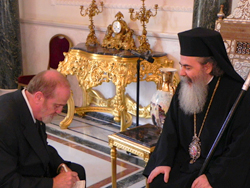 Our recent pilgrimage to the Holy Land was a life changing experience. One of the events that made our visit extraordinary was an audience with the Greek Orthodox Patriarch of Jerusalem. His Beatitude Theophilus III and his staff were gracious hosts. He was generous with his time and offered each one of us individually, his Patriarchal Blessing. I admired his wisdom and insight which was expressed in his remarks to our group of twenty two pilgrims. He told us, “Jerusalem is the history of Salvation, Sacred to Jews, Christians and Muslims as the guardians of the Holy Places by divine providence. To touch, by your hands, the places of Jesus Christ, your pilgrimage of vision will be conducive to helping us obtain union and contemplation of our Lord Jesus Christ. I wish you a happy stay”